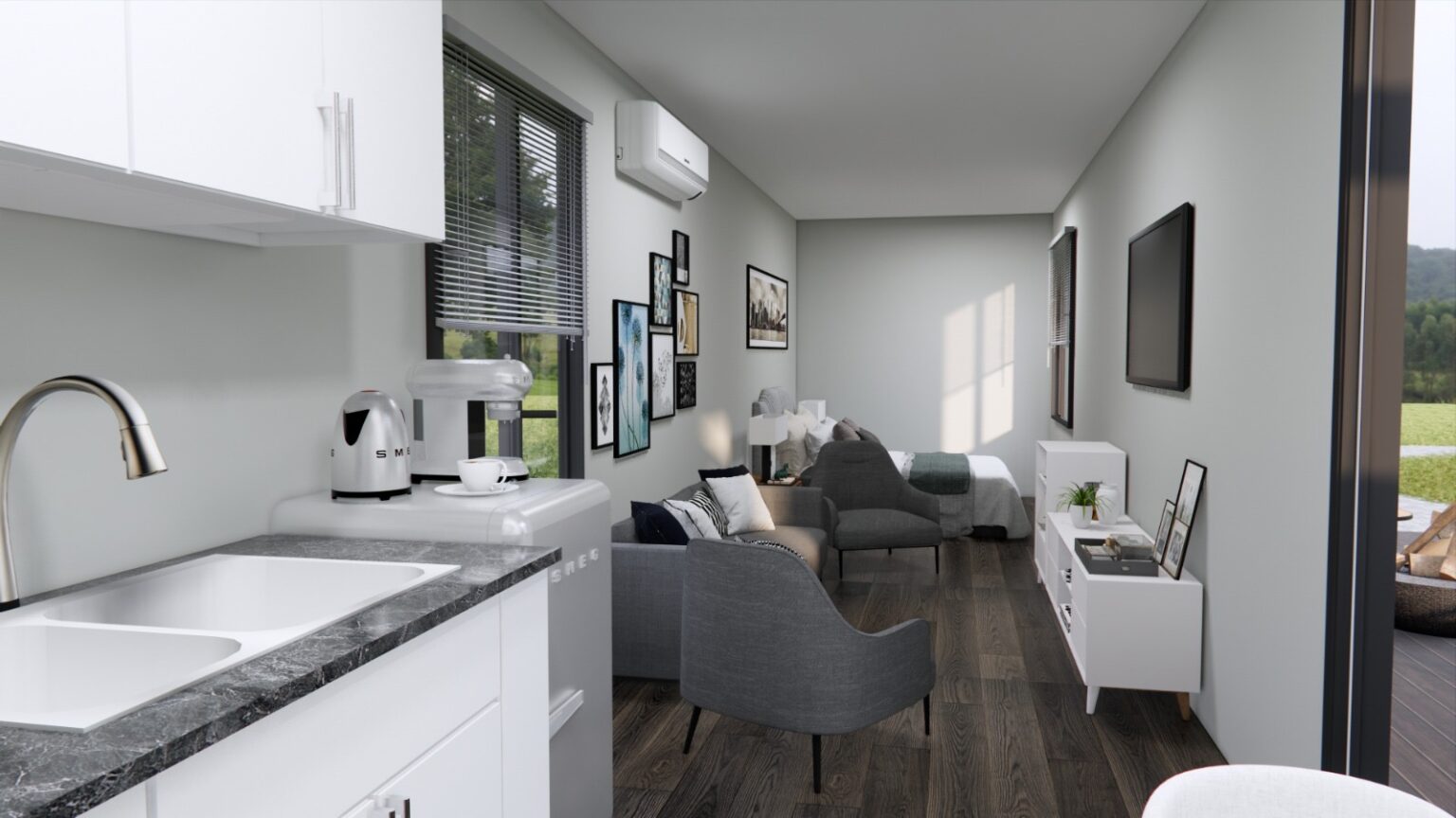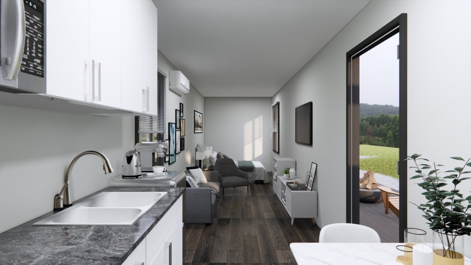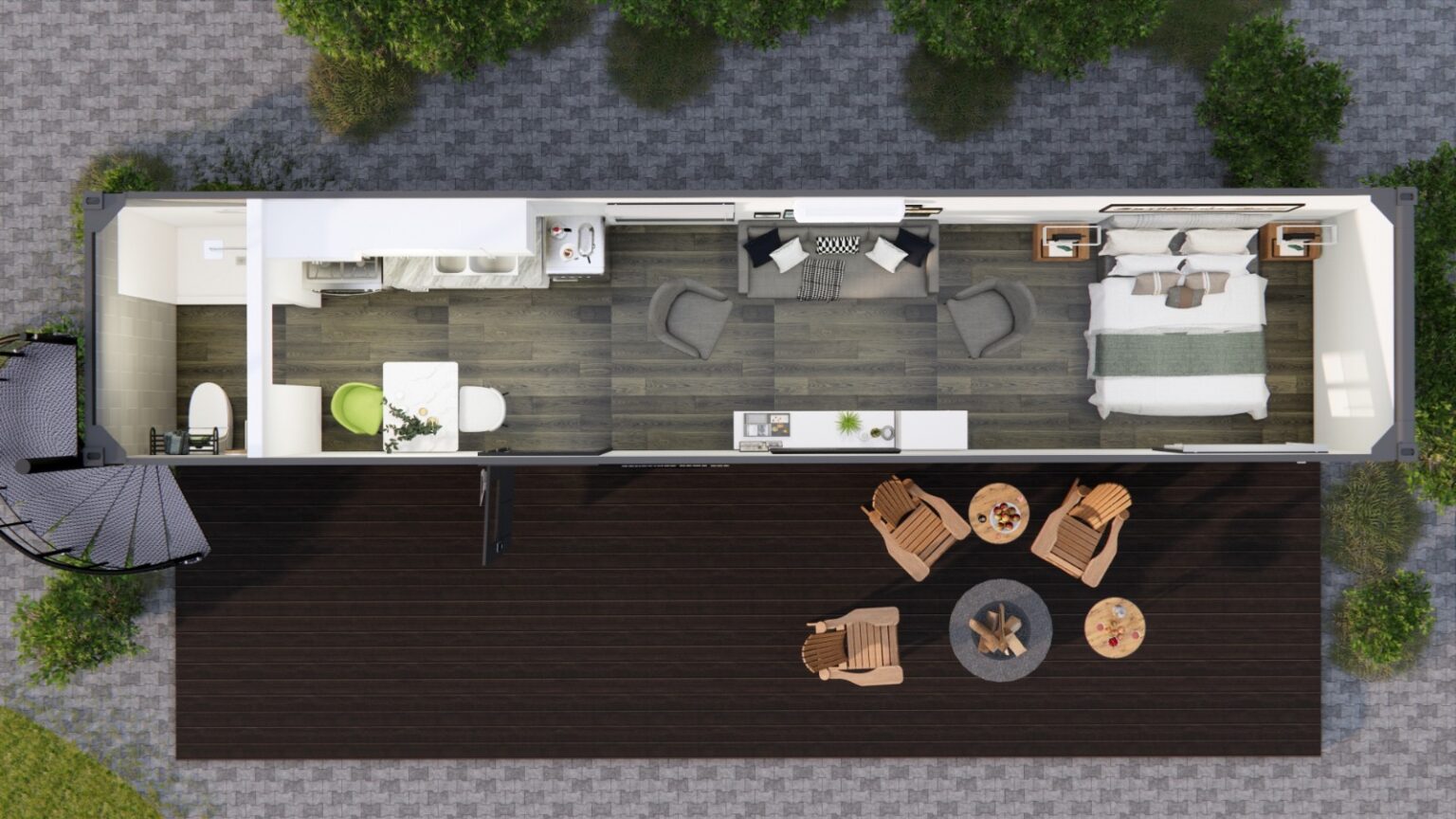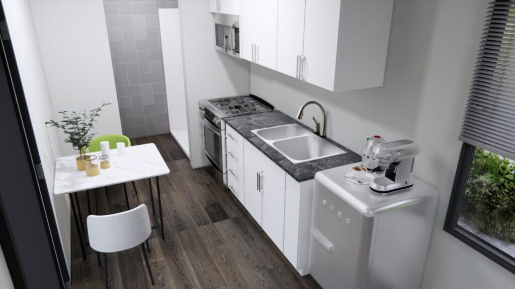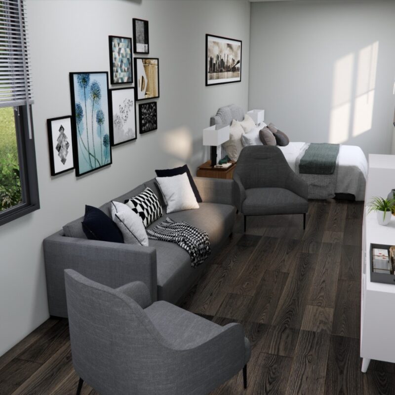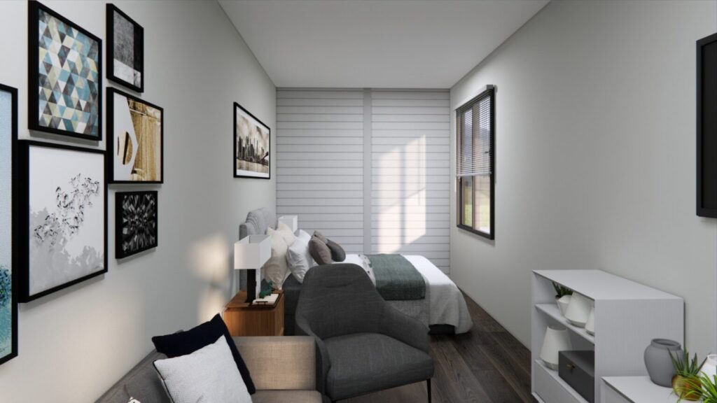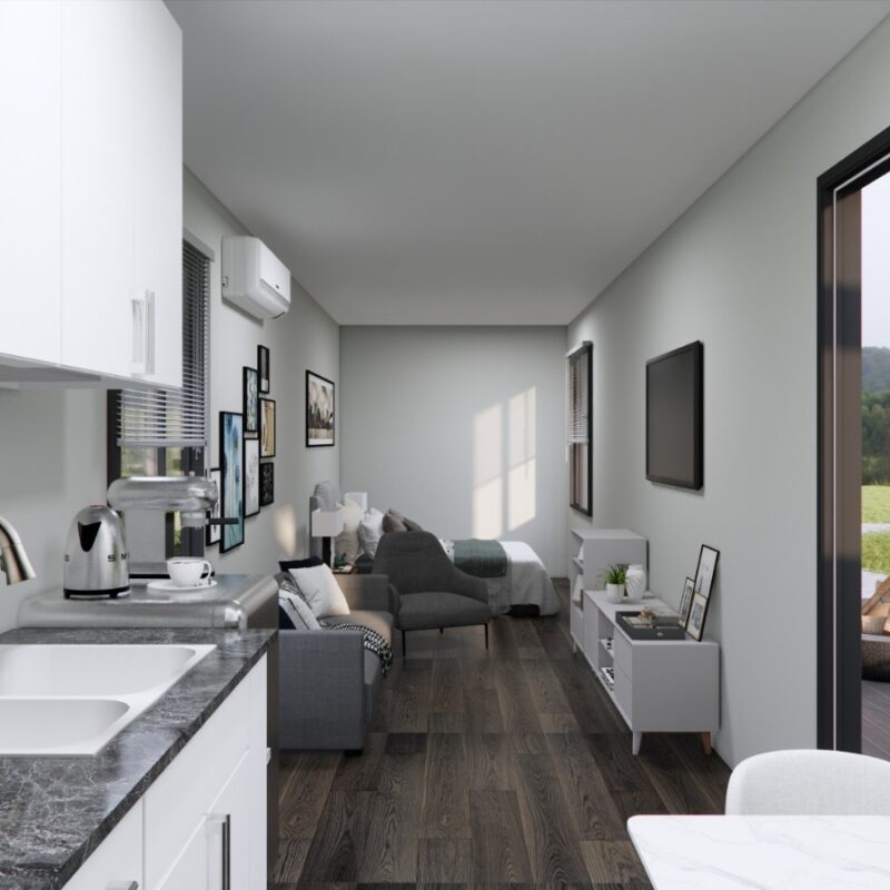 The Ridgewood 40 is an elegant yet economical open-concept studio built from a single 40-foot shipping container. This compact and versatile design is ideal for those seeking a minimalist lifestyle, a modern guest house, or an affordable short-term rental. With its thoughtfully planned layout and premium finishes, this studio strikes the perfect balance between affordability and functionality.
